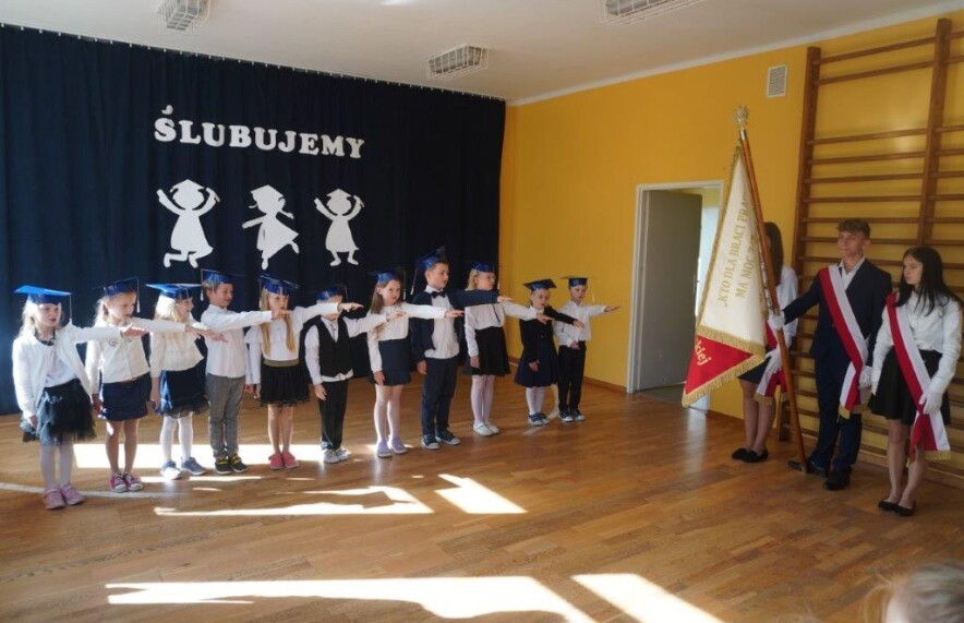 Był to dla nich wielki dzień. Przystąpiły do swojego pierwszego egzaminu. Aby stać się pełnoprawnymi uczniami szkoły, musiały wykazać się stosowną wiedzą i umiejętnościami. Zmagania dzieci oceniała cała społeczność szkolna na czele z Panią Dyrektor. Pierwszoklasiści zaśpiewali, pochwalili się znajomością szkolnych zasad, przedstawili Katechizm młodego Polaka oraz wypili sok z cytryny, zachowując uśmiech na twarzach. Młodzi uczniowie zabłysnęli wiadomościami, a publiczność zaliczyła wszystkie zadania i uznała, że dzieci są gotowe, aby przyjąć je do społeczności szkolnej.