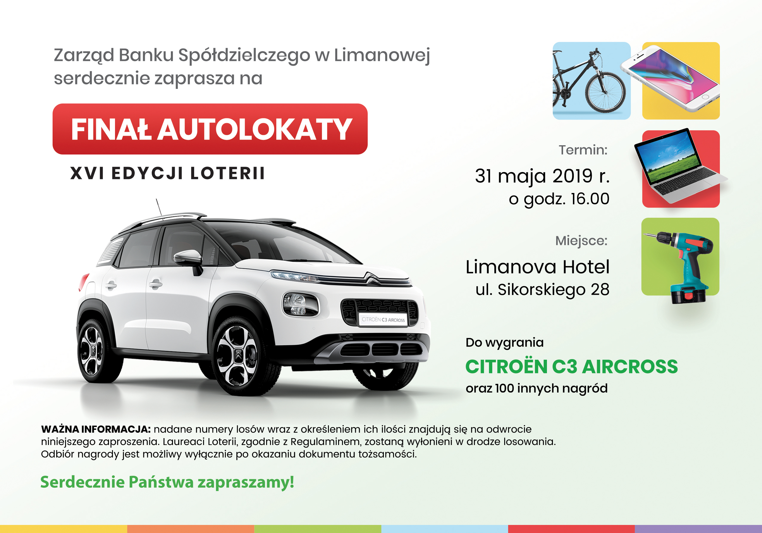 Przypominamy także, że 31 maja 2019r. poznanym szczęśliwców XVI edycji loterii promocyjnej AUTOLOKTA, w której nagrodą główną jest samochód osobowy Citroën C3 Aircross.