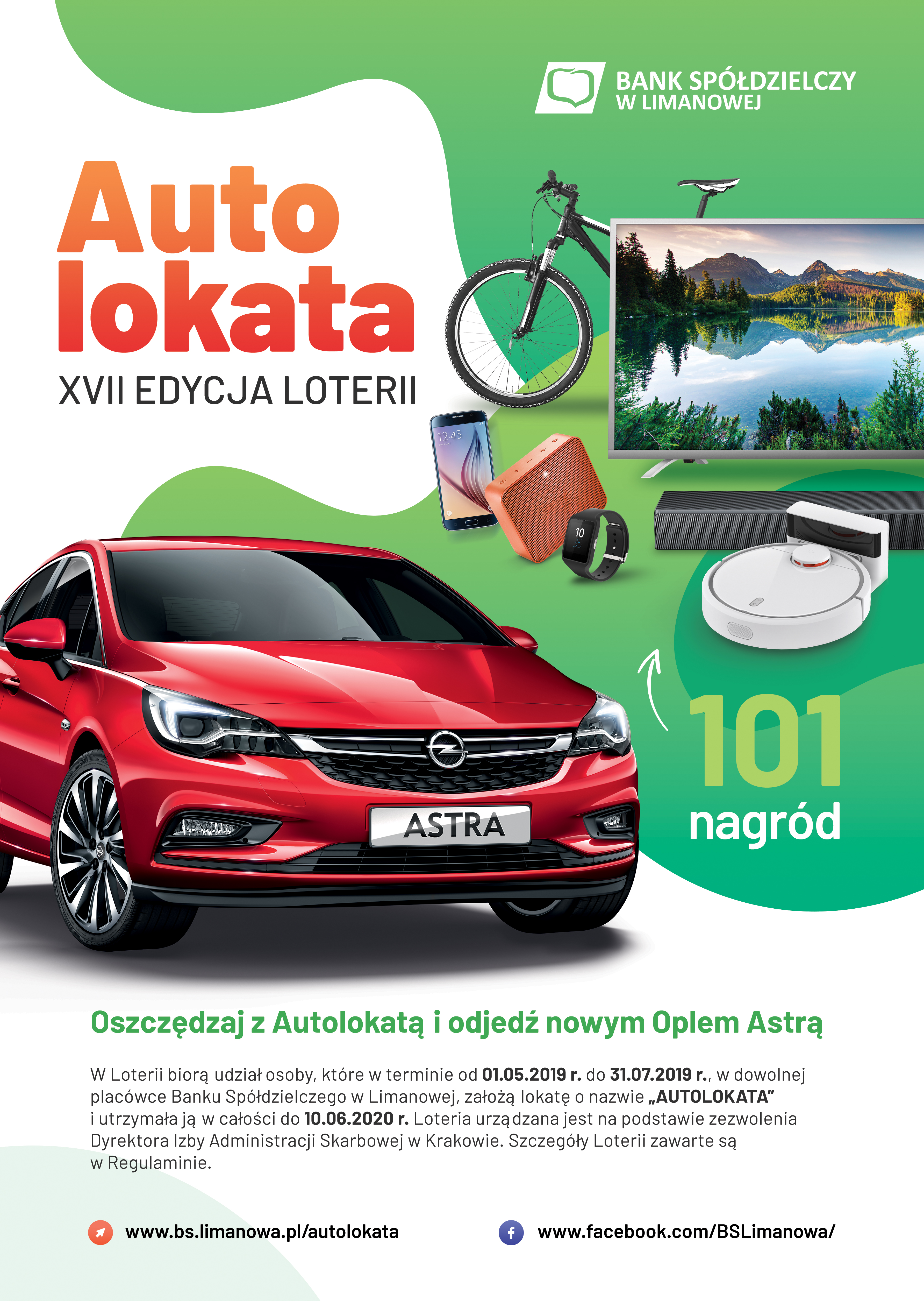 Pragniemy przypomnieć, iż warunkiem uczestnictwa w loterii jest założenie w okresie promocyjnym tj. 01.05.2019r. do 31.07.2019r. lokaty o nazwie AUTOLOKATA i utrzymanie jej do 10.06.2020r. Minimalna kwota wpłaty to 1000 zł, a każda wielokrotność tej kwoty jest kolejnym losem w loterii, podwyższającym szanse na wylosowanie nagrody.