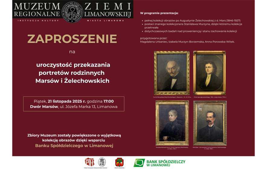 W wydarzeniu wezmą udział członkowie Zarządu banku oraz władze miasta Limanowa. Uroczystość będzie jednocześnie podsumowaniem kilkuletnich działań Muzeum związanych z pozyskiwaniem zbiorów z niezwykłej kolekcji zabytkowych portretów rodziny Marsów i Żelechowskich. Spotkanie ma charakter otwarty dla wszystkich zainteresowanych.