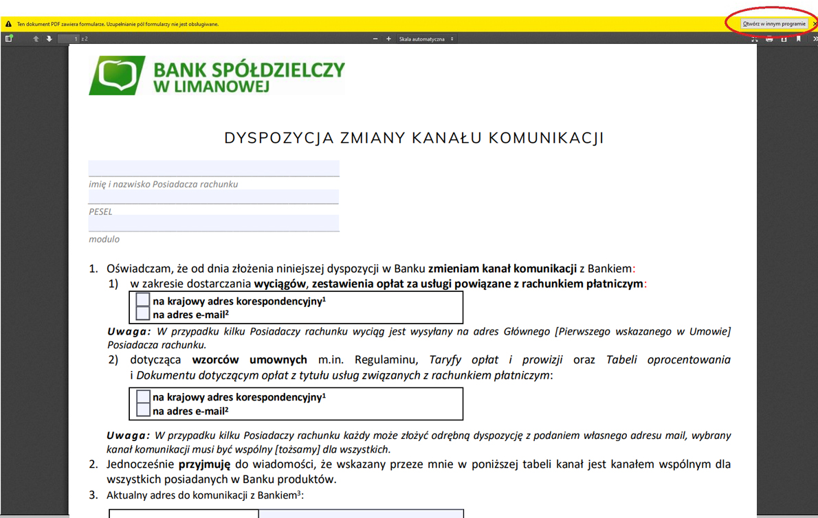 Pobierz formularz: Dyzpozycja zmiany kanału komunikacji z bankiemNa górze wniosku pojawi się żółty pasek, należy wybrać opcję „otwórz w innym programie”, wówczas Formularz będzie dostępny w wersji do uzupełnienia. Wypełnij wniosek i zapisz w formacie *PDF