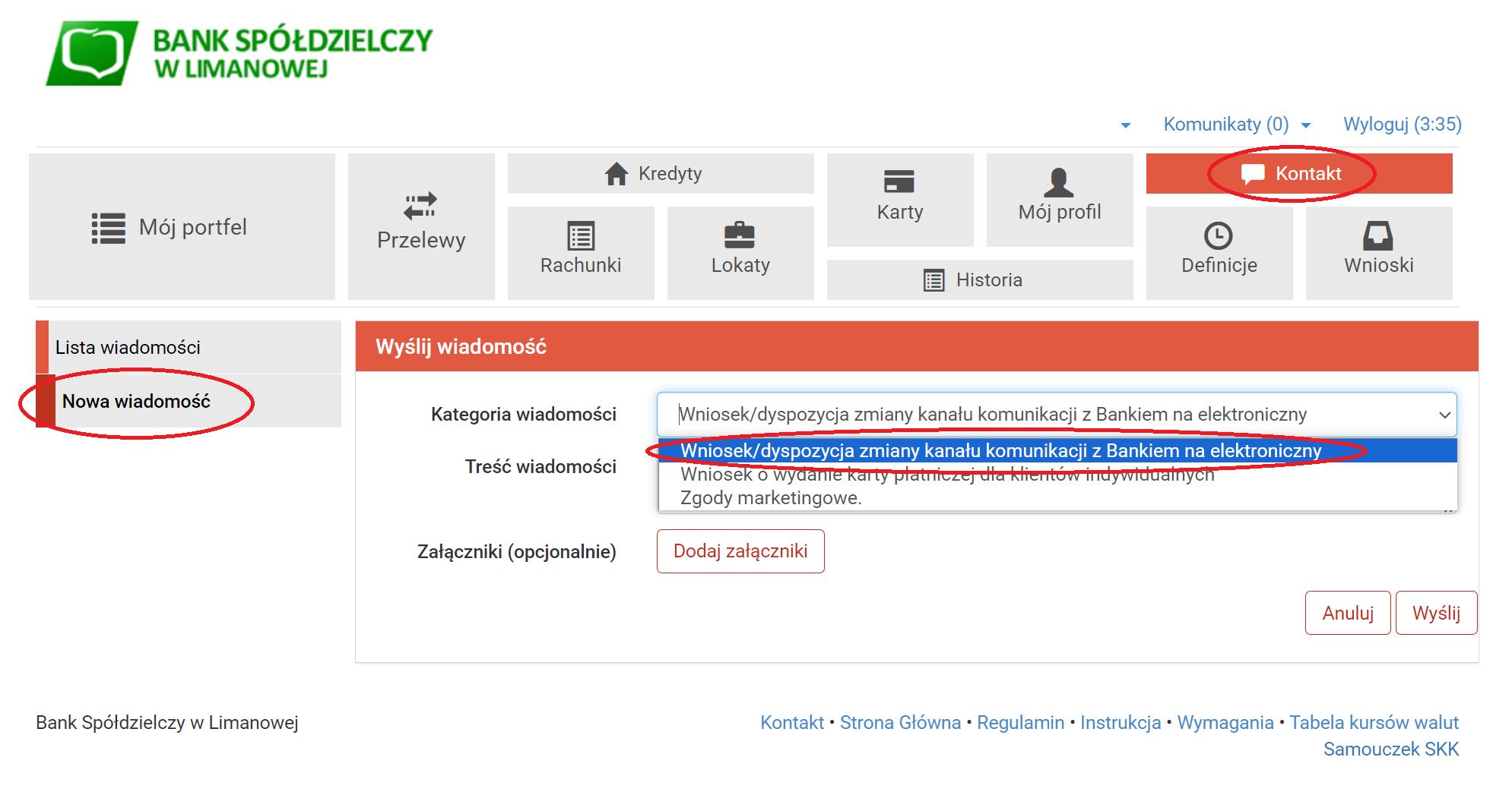 Zaloguj się do bankowości elektronicznej eBankNet wybierz zakładkę ‘Kontakt’, a następnie z menu bocznego ‘Nowa wiadomość’. W polu ‘Kategoria wiadomości’ pojawia się lista rozwijana, z której należy wybrać ‘Wniosek/dyspozycja zmiany kanału komunikacji z Bankiem na elektroniczny’