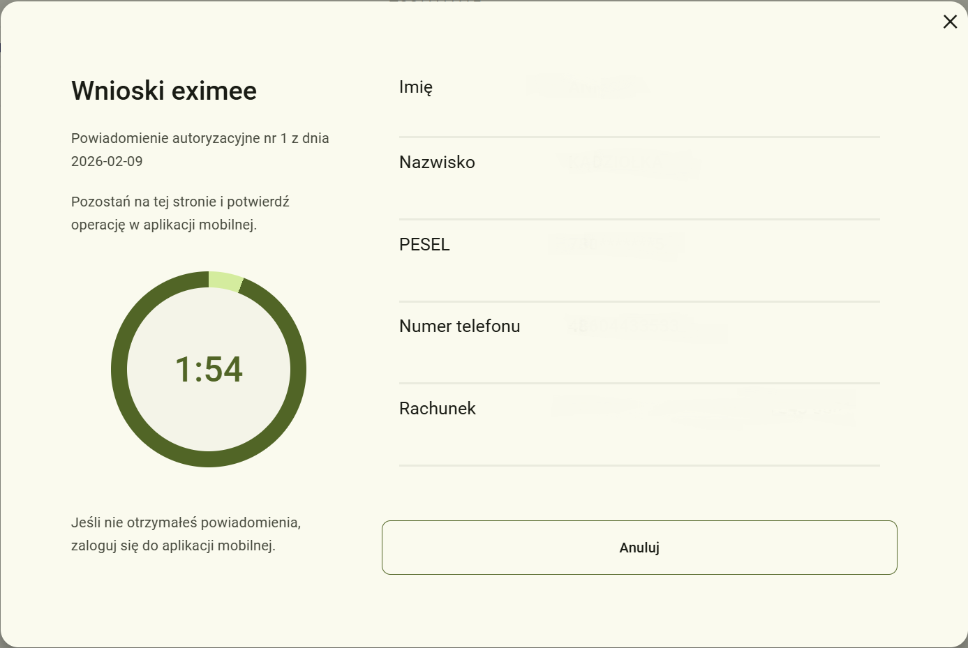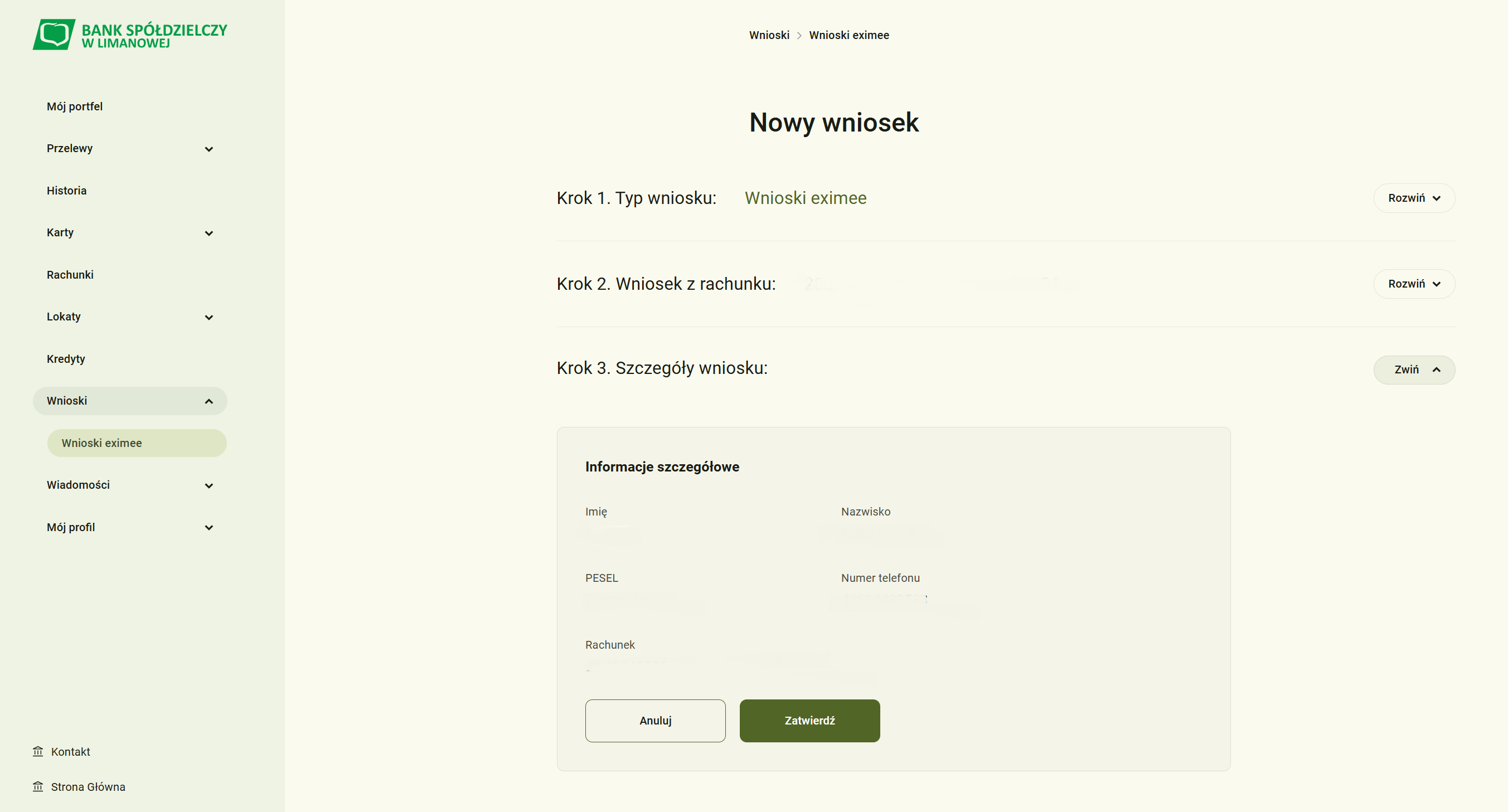 Po wybraniu rachunku, z którego ma być złożony wniosek, zostaniesz przekierowany na podstronę z danymi, które musimy potwierdzić.